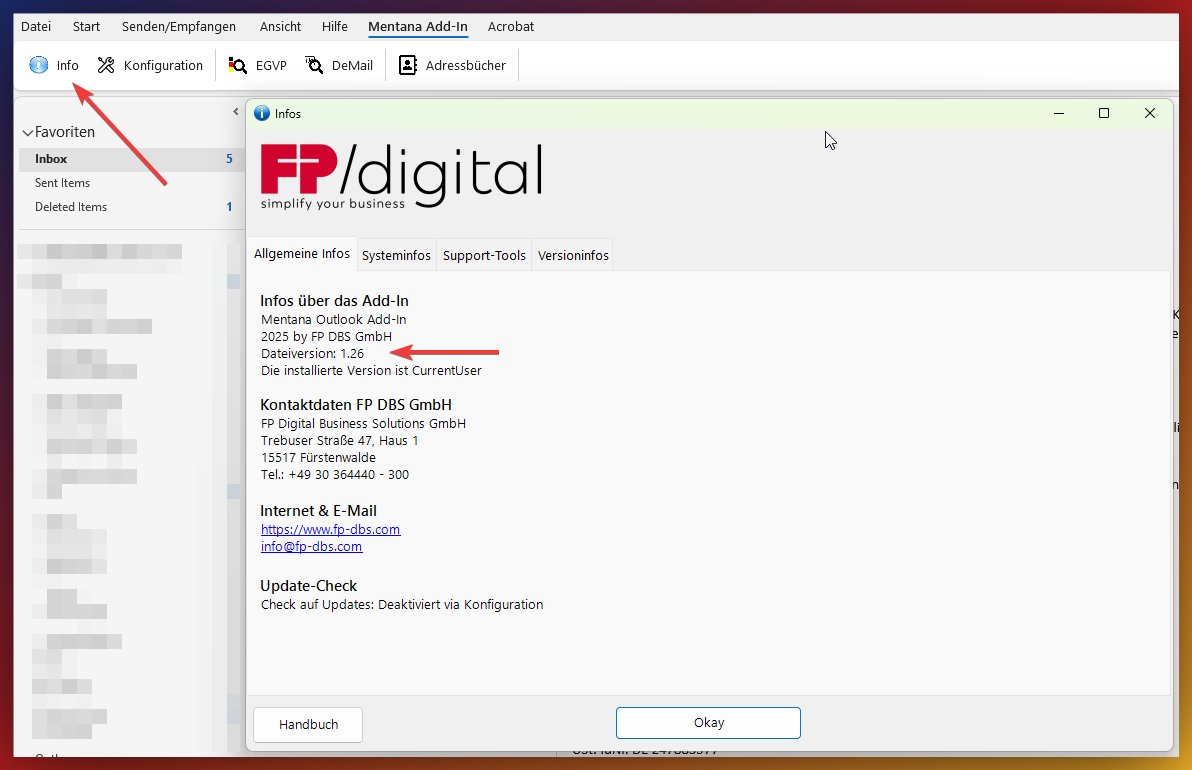 Um die Versionsnummer zu sehen, gehen Sie in Outlook auf den Reiter des Mentana-Add-Ins und klicken Sie auf "Info". Die Informationen über die Software werden angezeigt.
