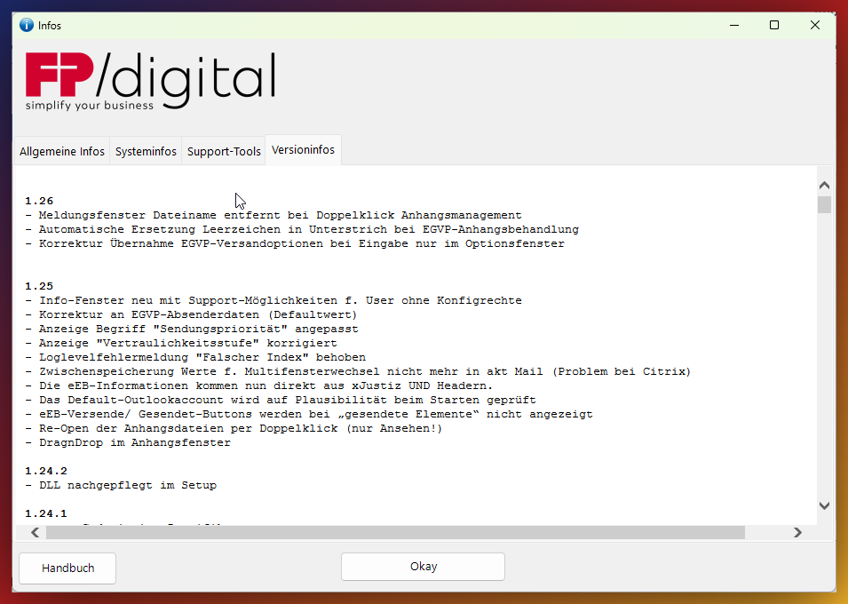 Wenn Sie im Programm auf "Info" klicken und zum Punkt "Versionsinfos" navigieren, können Sie den Updateverlauf und die darin enthaltenen Änderungen sehen.