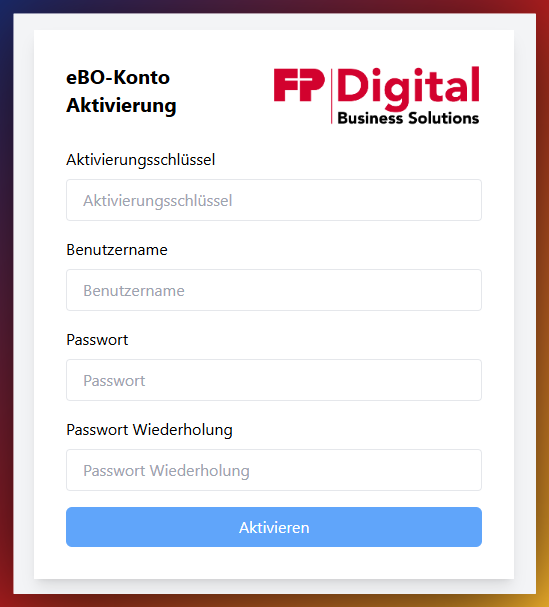 Nach dem Klick auf den Link in der Begrüßungsmail muss ein individueller Aktivierungsschlüssel eingegeben werden, der ebenfalls von FP Digital nach der Einrichtung per SMS bereitgestellt wird. Dadurch wird die Zuordnung des Accounts sichergestellt.