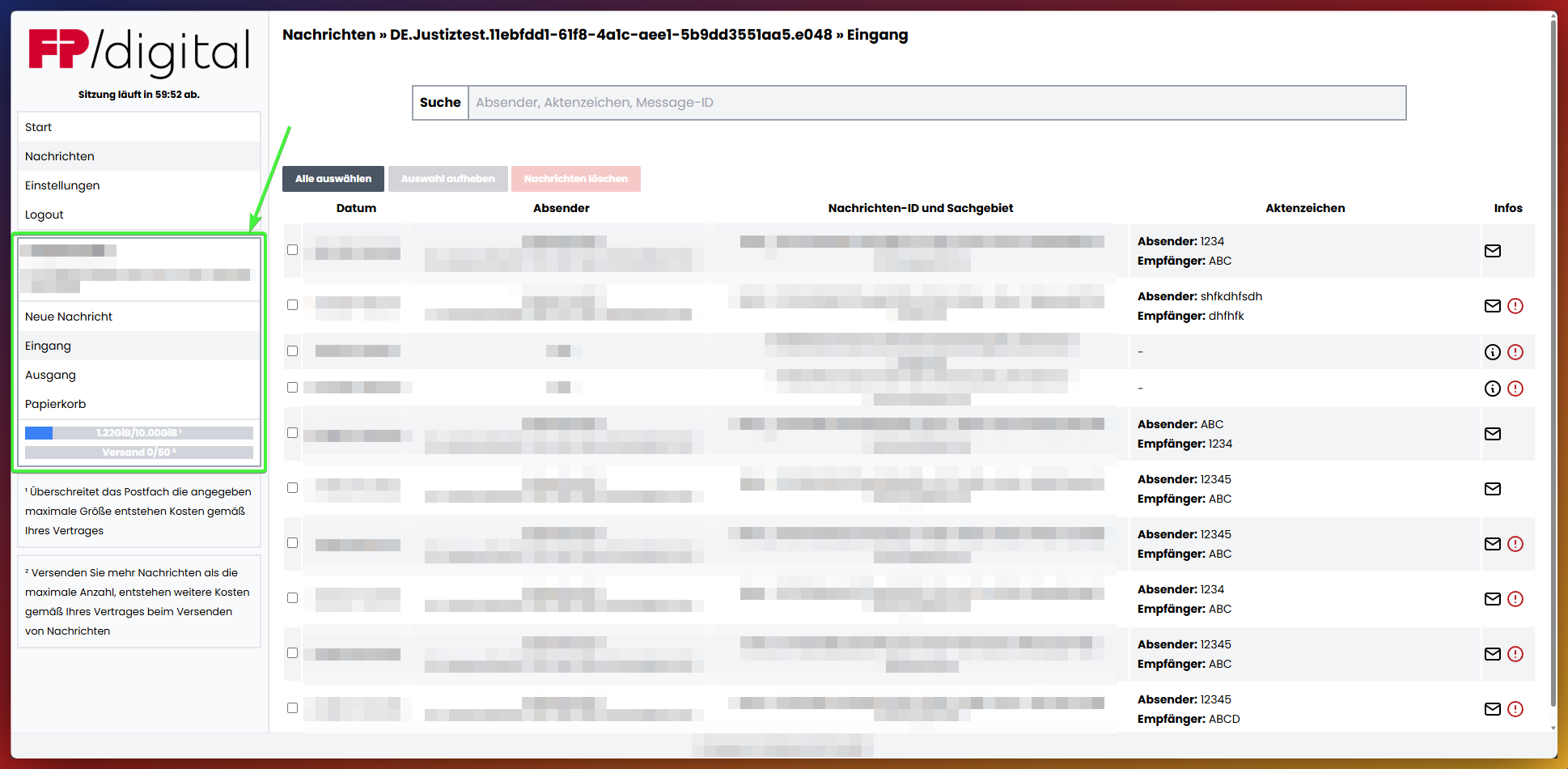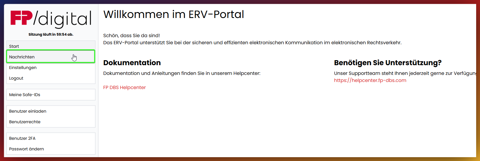 Um die eingegangenen Nachrichten zu lesen, in der Seitenleiste zum Menüpunkt 'Nachrichten' navigieren. Wenn auf Nachrichten geklickt wurde, öffnet sich das Postfach automatisch im Posteingang. Klicken Sie anschließend auf die gewünschte Nachricht in der Übersicht, um diese zu öffnen.