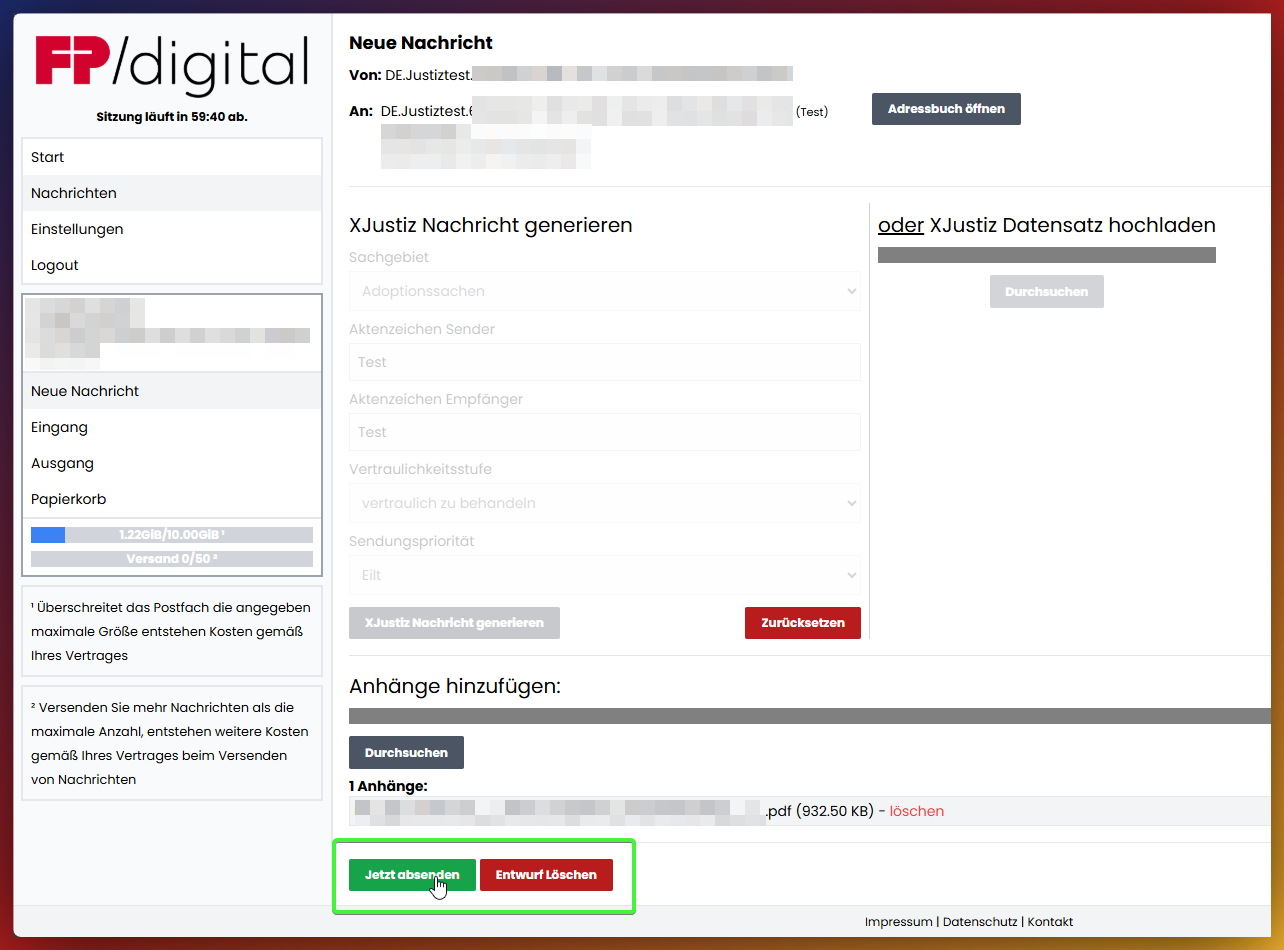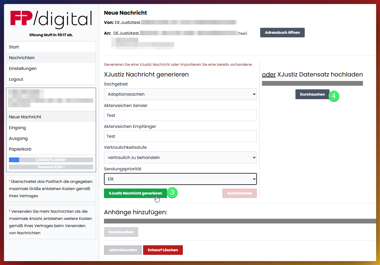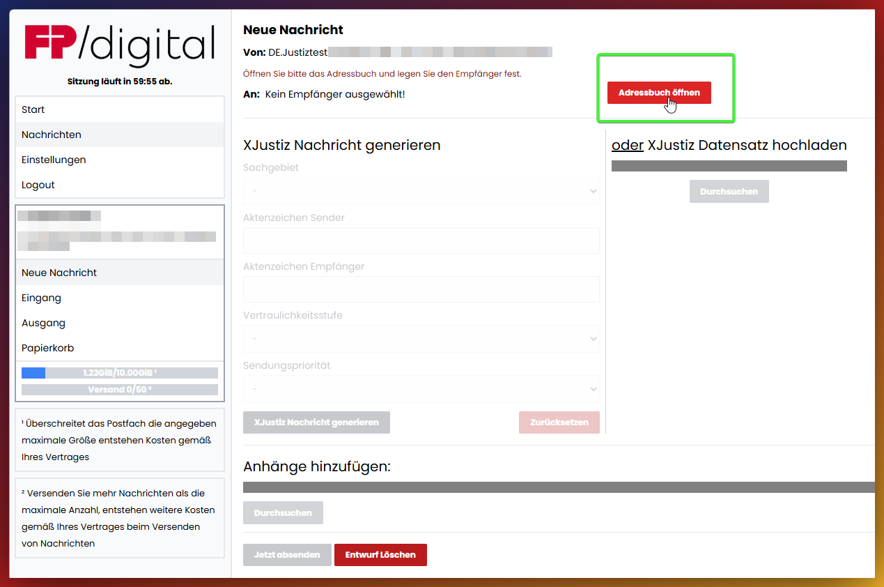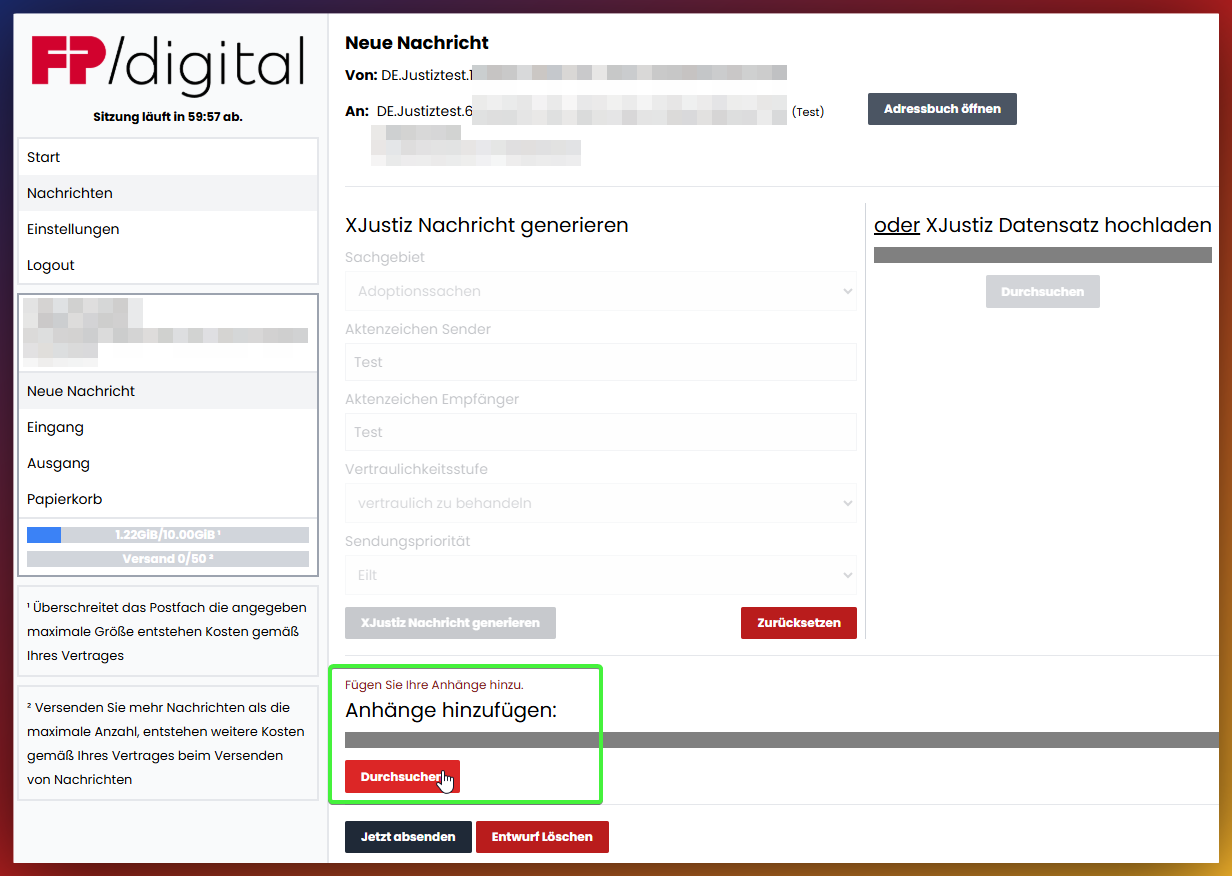 - Anhänge hinzufügen:Fügen Sie Ihrer Nachricht eine oder mehrere Dateien von Ihrem Computer als Anhang bei.Bitte beachten: es können keine Nachrichten direkt im Portal geschrieben werden. Die Nachricht muss in einem beliebigen Texteditor verfasst und dann als Anhang hochgeladen werden! In der Regel erwarten die Gerichte eine PDF Datei.