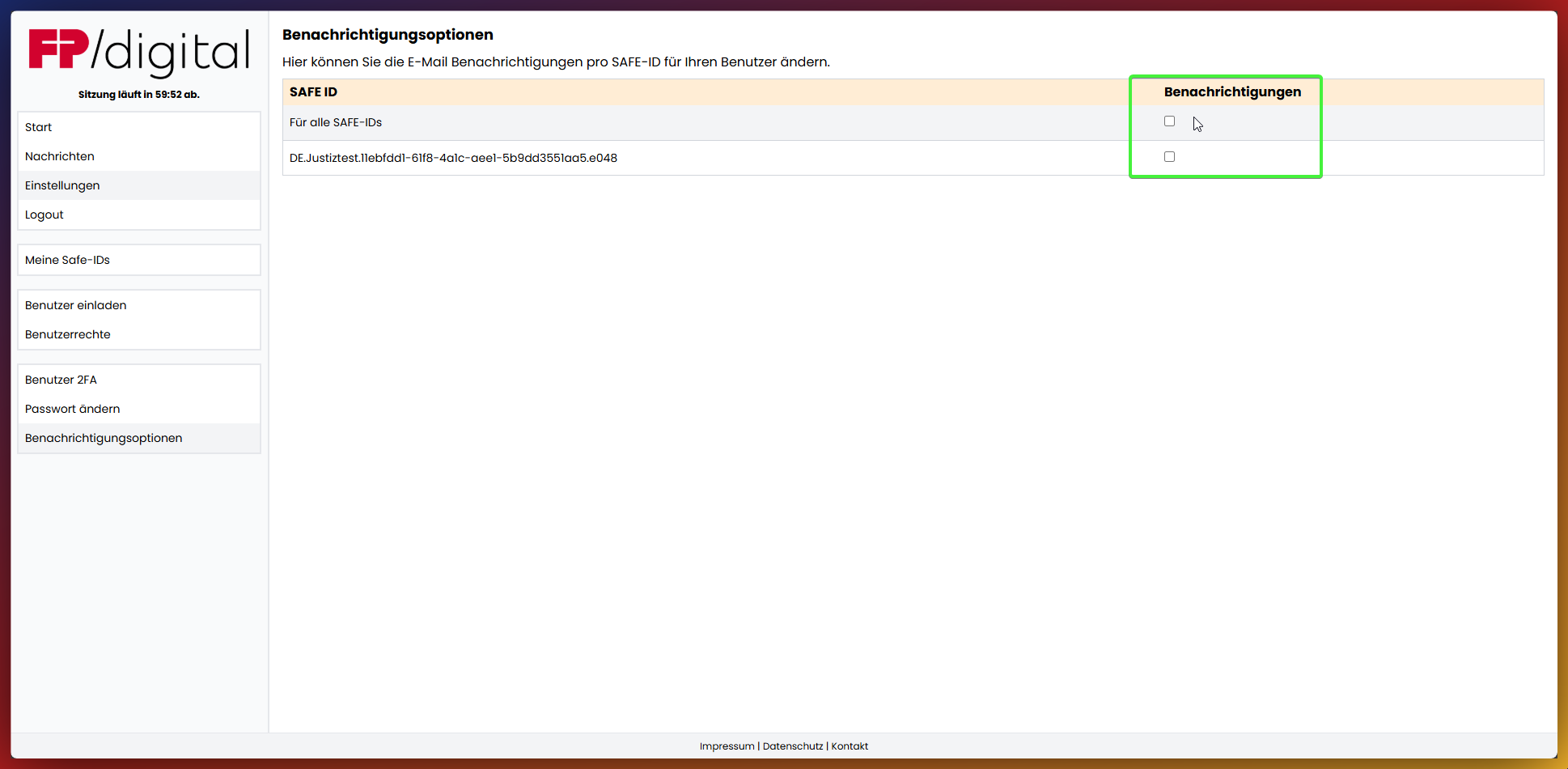 Mit dieser Funktion wird für eine ausgewählte SAFE-ID eine Benachrichtigung per E-Mail an die hinterlegte Referenz-Mailadresse versendet, sobald neue Nachrichten im Postfach eingehen.